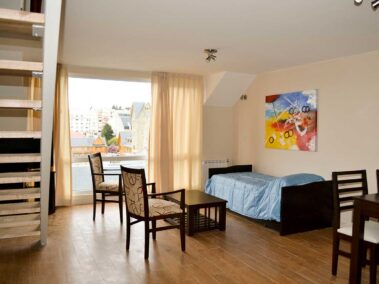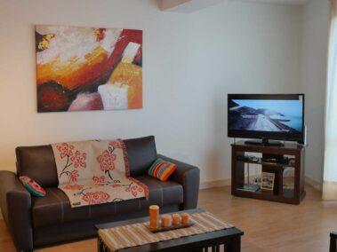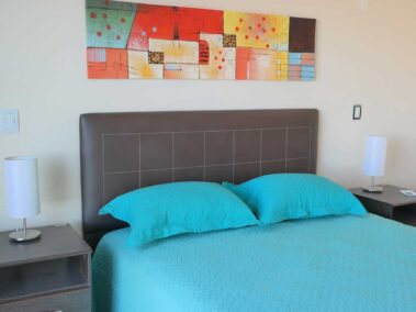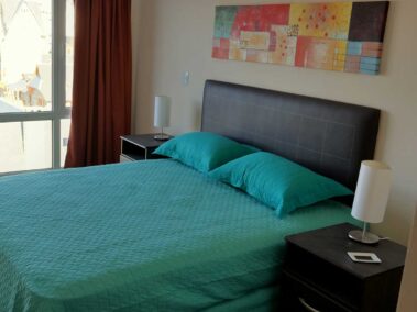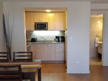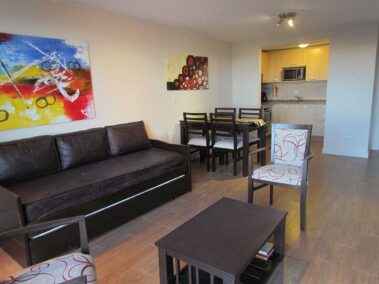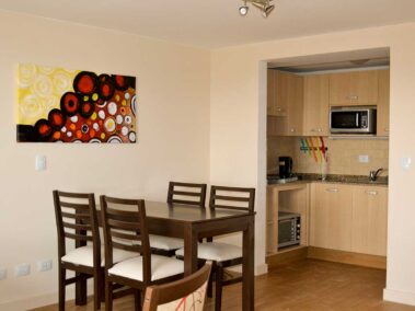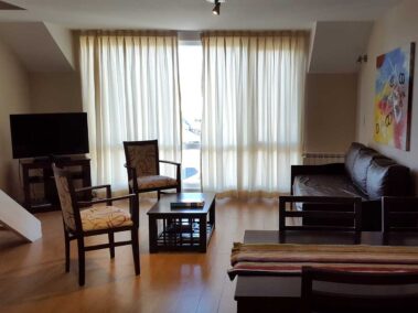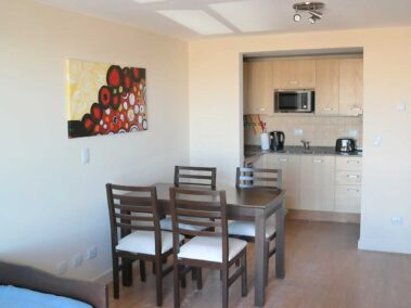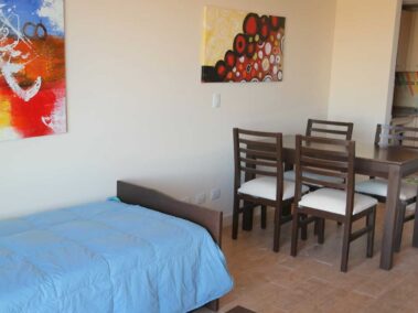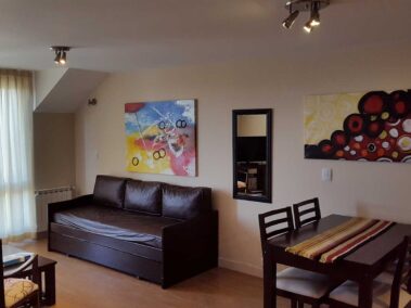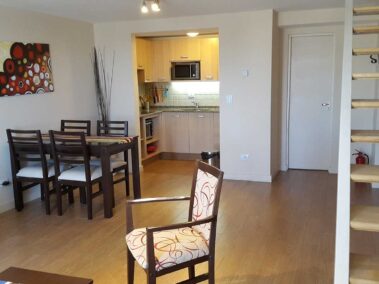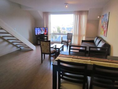 Esta unidad es un dúplex de 2 ambientes, se compone de una habitación matrimonial en la planta alta con cama somier Queen, baño completo y vestidor, Living y cocina con anafes y horno eléctrico, diván cama para dos personas en el living y toilette en planta baja.