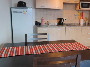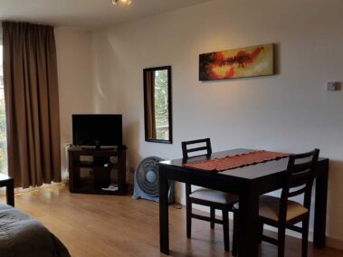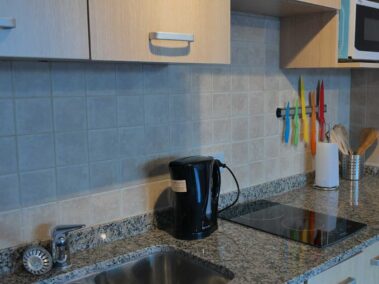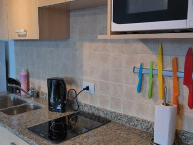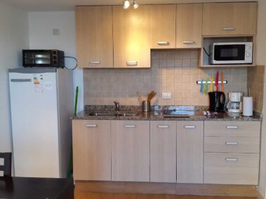 Esta unidad es un Monoambiente, se compone de un sommier matrimonial, capacidad máxima, 2 pasajeros, 3 con cama adicional, baño completo, cocina con vitroceramica, heladera, microondas, jarra hervidora y tostador