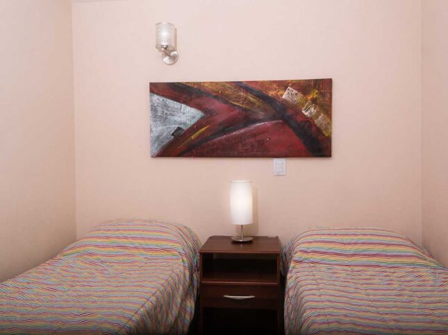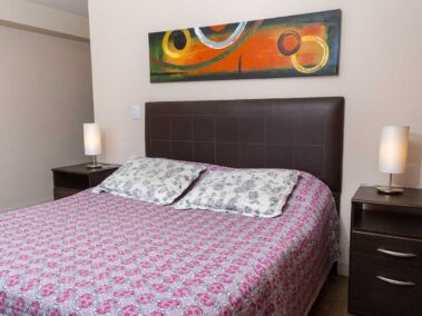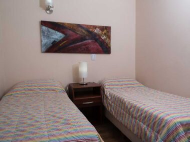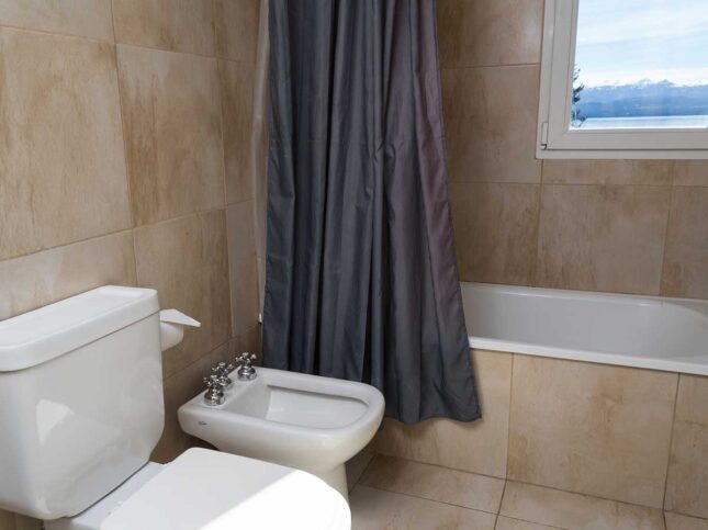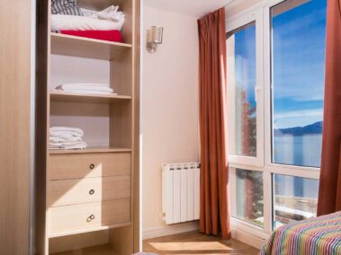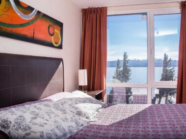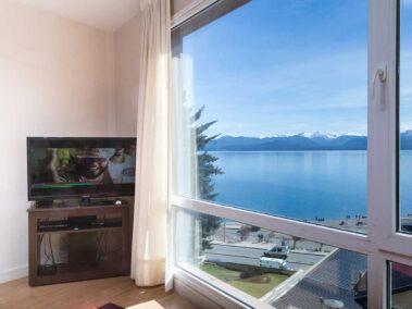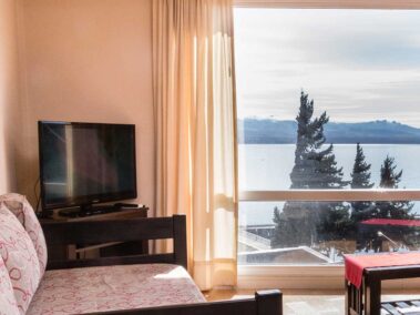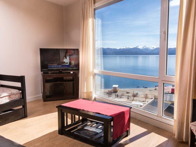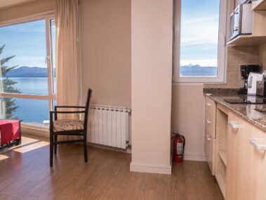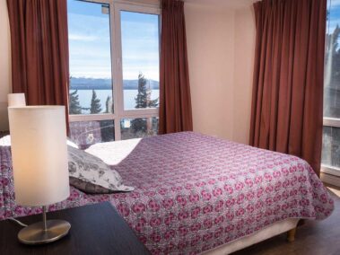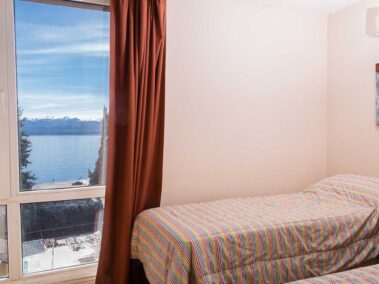 Este departamento consta de 3 ambientes que se compone de una habitación con sommier Queen, otra habitación con dos camas somier que se pueden unir en un somier doble, baño completo, cocina completa y diván cama en el living. La vista al lago se disfruta de todos los ambientes.